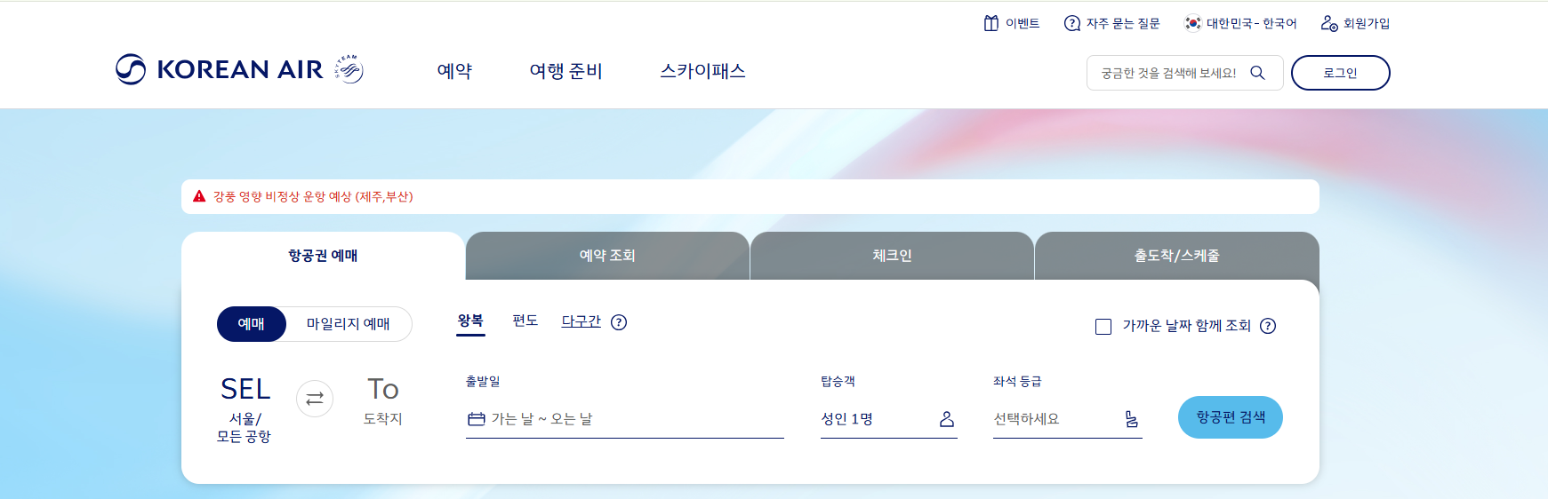 대한항공 홈페이지에 접속하면 가장 먼저 눈에 들어오는 것이 깔끔하고 직관적인 항공권 예매 메뉴입니다.