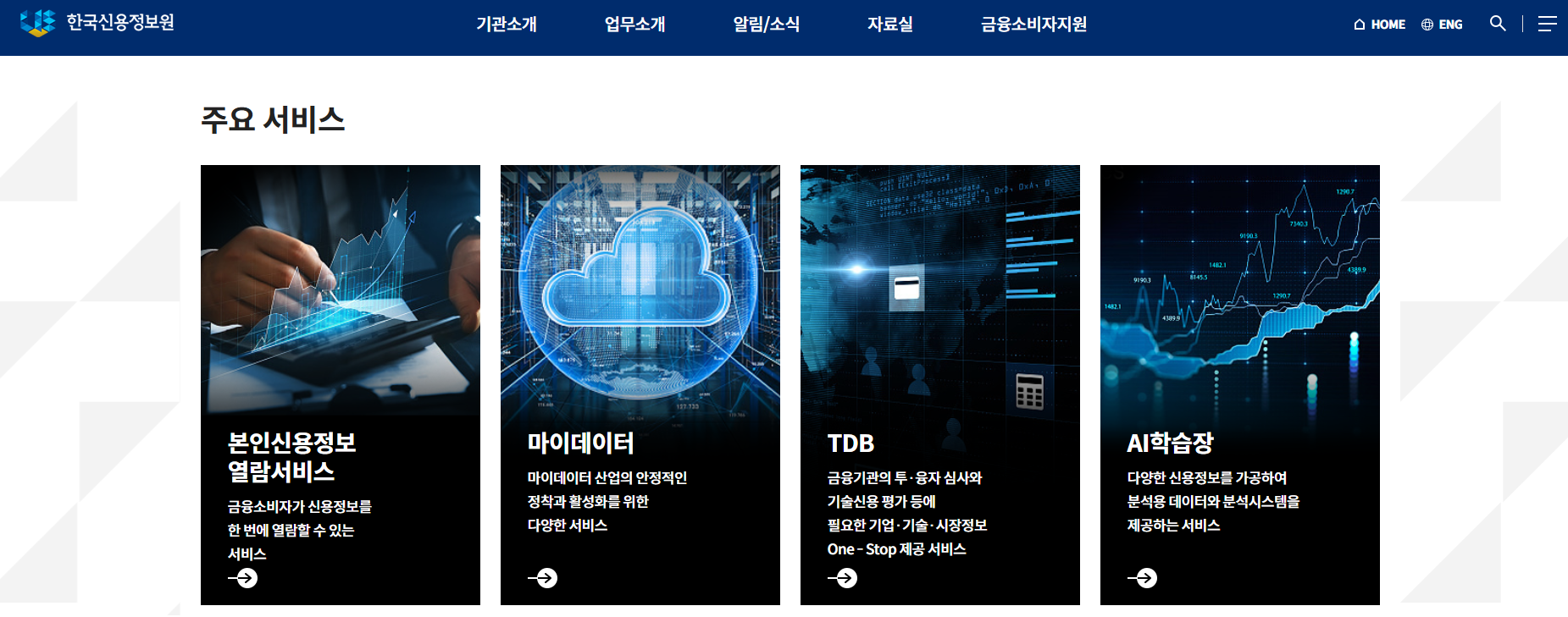 한국신용정보원 홈페이지는 신용정보를 가장 공식적이고 정확하게 확인할 수 있는 국가기관 서비스입니다.